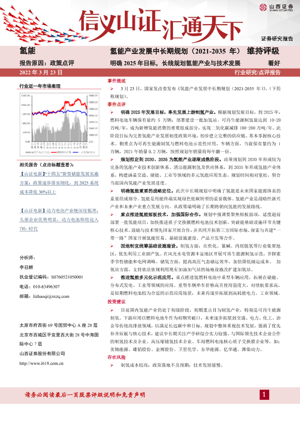 【山西证券】【20220323】氢能产业发展中长期规划(2021-2035年):明确2025年目标,长线规划氢能产业与技术发展-2页