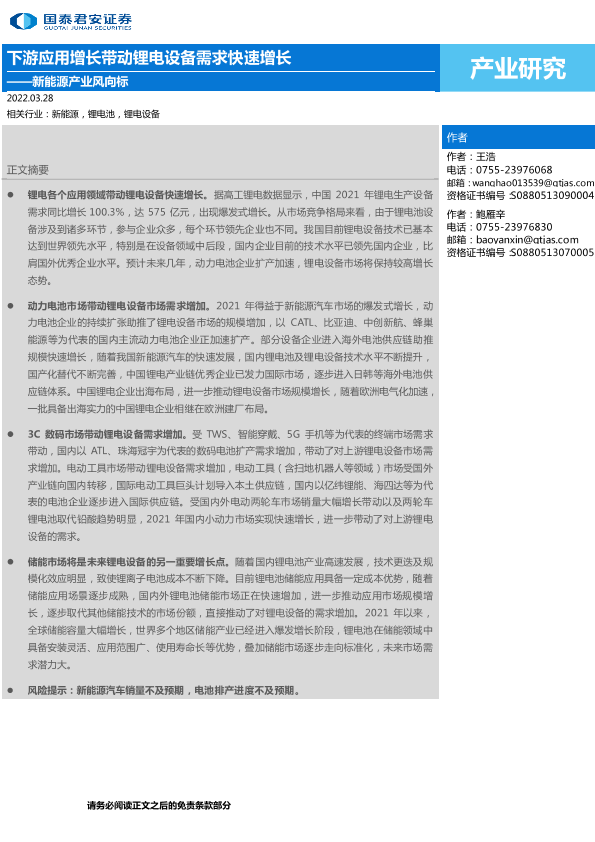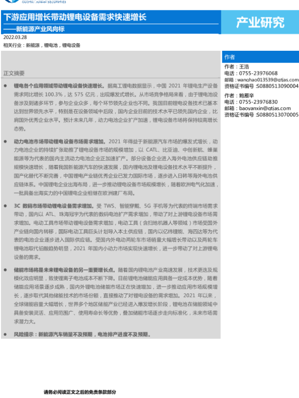 【国泰君安证券】【20220328】新能源产业风向标:下游应用增长带动锂电设备需求快速增长-2页