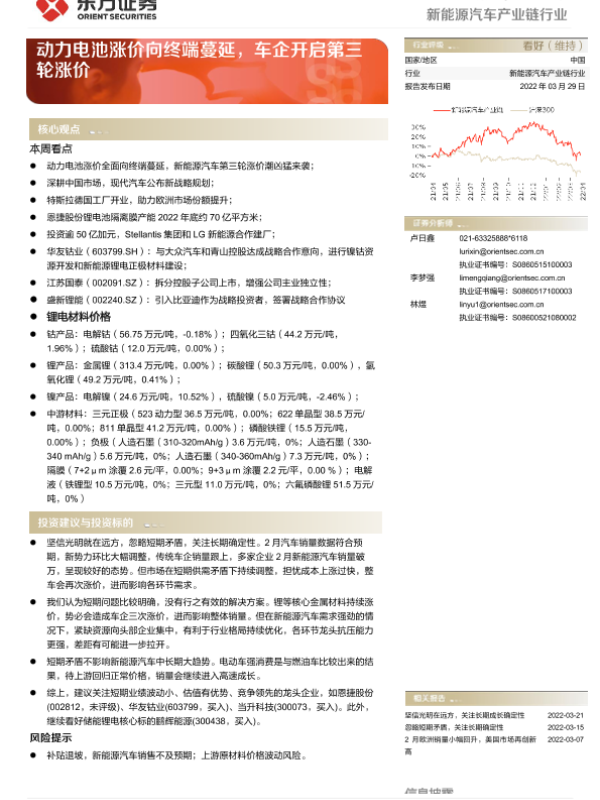 【东方证券】【20220329】新能源汽车产业链行业:动力电池涨价向终端蔓延,车企开启第三轮涨价-18页