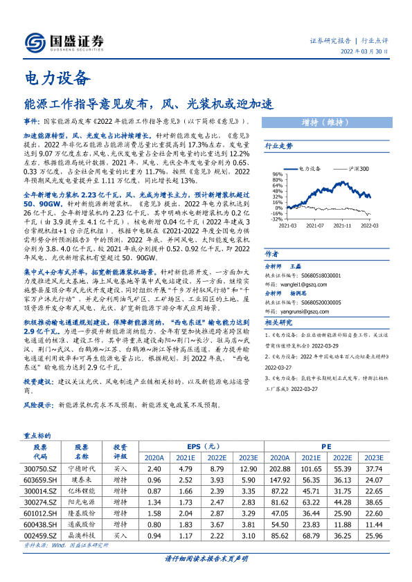 【国盛证券】【20220330】电力设备:能源工作指导意见发布,风、光装机或迎加速-2页