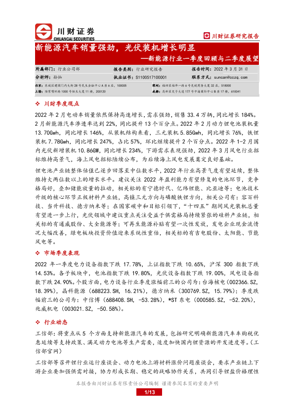 【川财证券】【20220331】新能源行业一季度回顾与二季度展望:新能源汽车销量强劲,光伏装机增长明显-13页