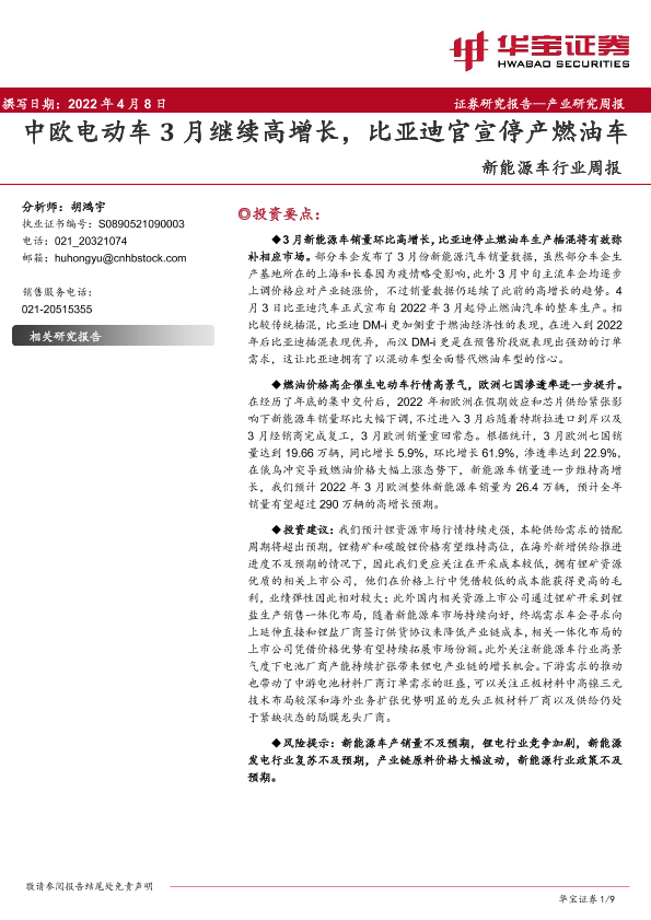 【华宝证券】【20220408】20220408-华宝证券-新能源车行业周报:中欧电动车3月继续高增长,比亚迪官宣停产燃油车-9页