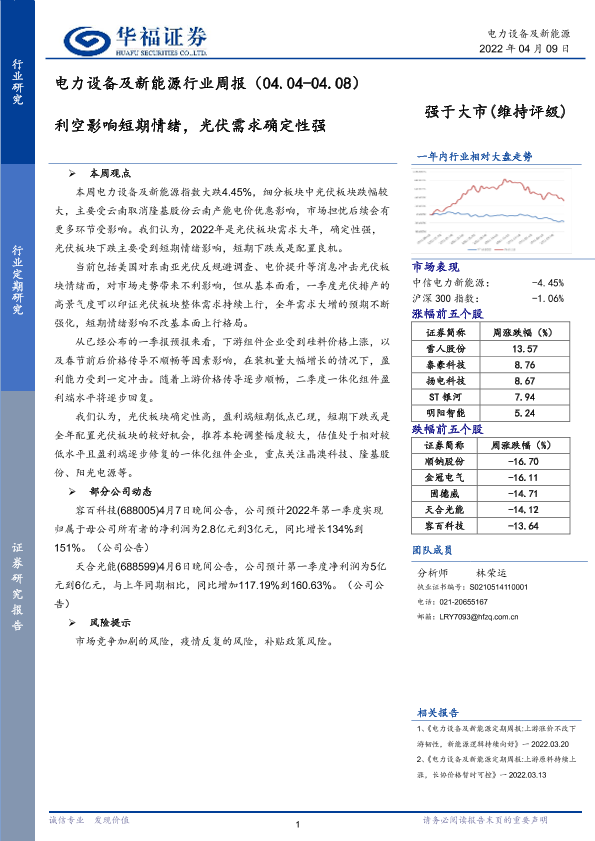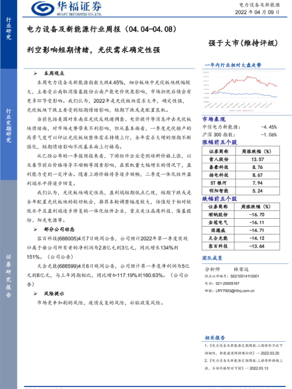 【华福证券】【20220409】电力设备及新能源行业周报:利空影响短期情绪,光伏需求确定性强-7页