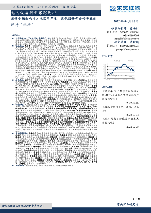 【东吴证券】【20220410】电力设备行业跟踪周报:疫情小幅影响4月电动车产量,光伏组件部分传导涨价-39页