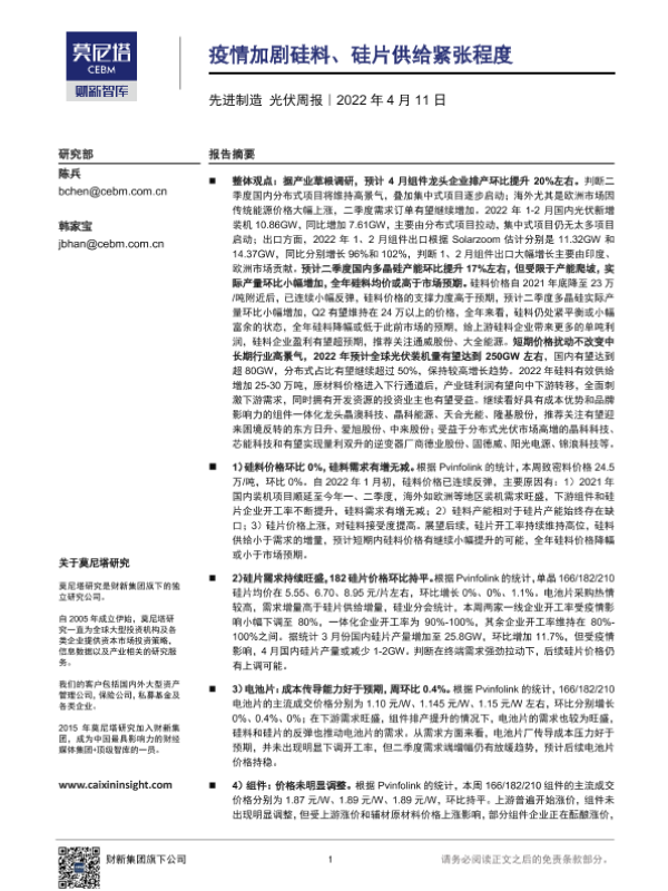 【莫尼塔研究】【20220411】光伏周报:疫情加剧硅料、硅片供给紧张程度-17页