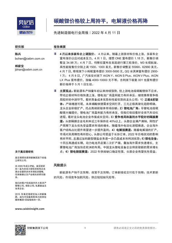 【莫尼塔研究】【20220411】20220411-莫尼塔投资-先进制造锂电行业周报:碳酸锂价格较上周持平,电解液价格再降-13页