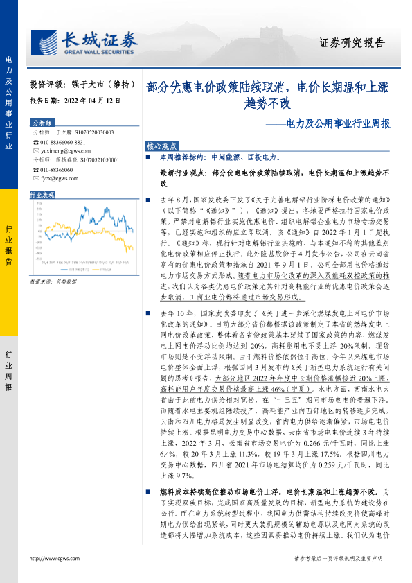 【长城证券】【20220412】电力及公用事业行业周报:部分优惠电价政策陆续取消,电价长期温和上涨趋势不改-10页