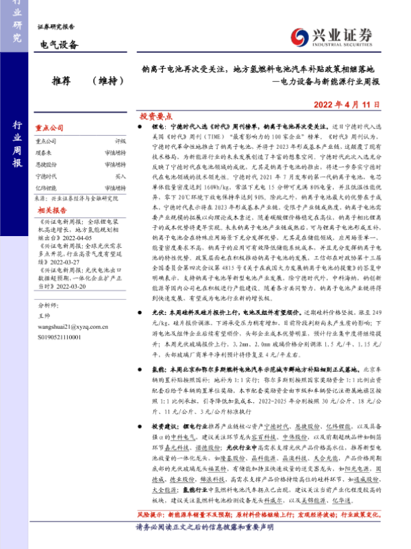 【兴业证券】【20220411】钠离子电池再次受关注,地方氢燃料电池汽车补贴政策相继落地 —电力设备与新能源行业周报-21页