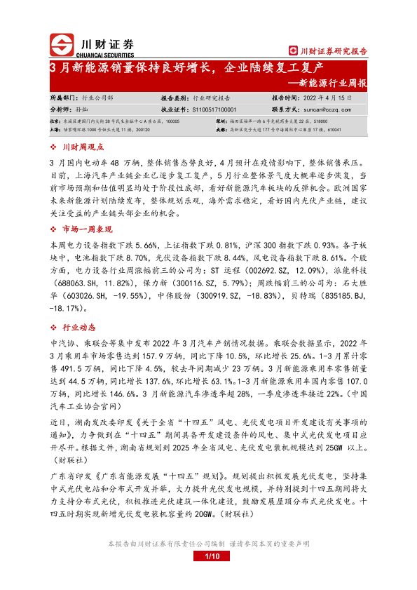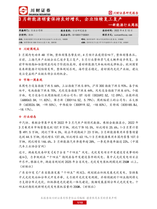 【川财证券】【20220415】20220415-川财证券-新能源行业周报:3月新能源销量保持良好增长,企业陆续复工复产-10页
