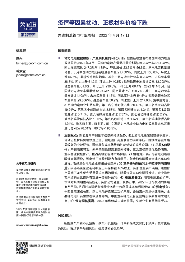【莫尼塔研究】【20220417】先进制造锂电行业周报:疫情等因素扰动,正极材料价格下跌-12页
