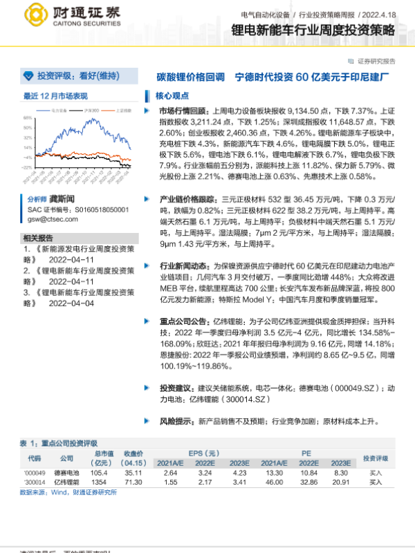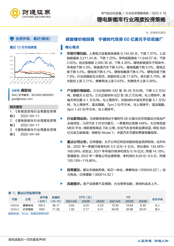 【财通证券】【20220418】锂电新能车行业周度投资策略:碳酸锂价格回调 宁德时代投资60亿美元于印尼建厂-19页