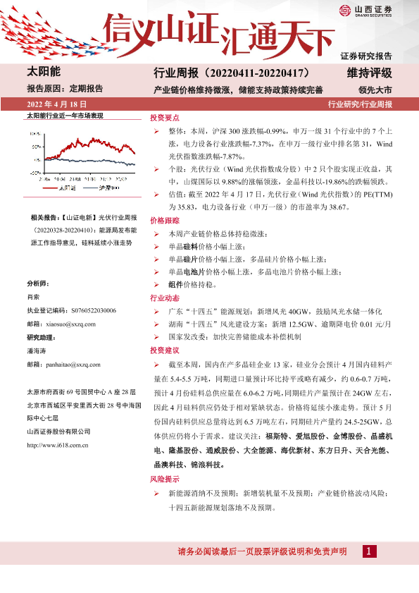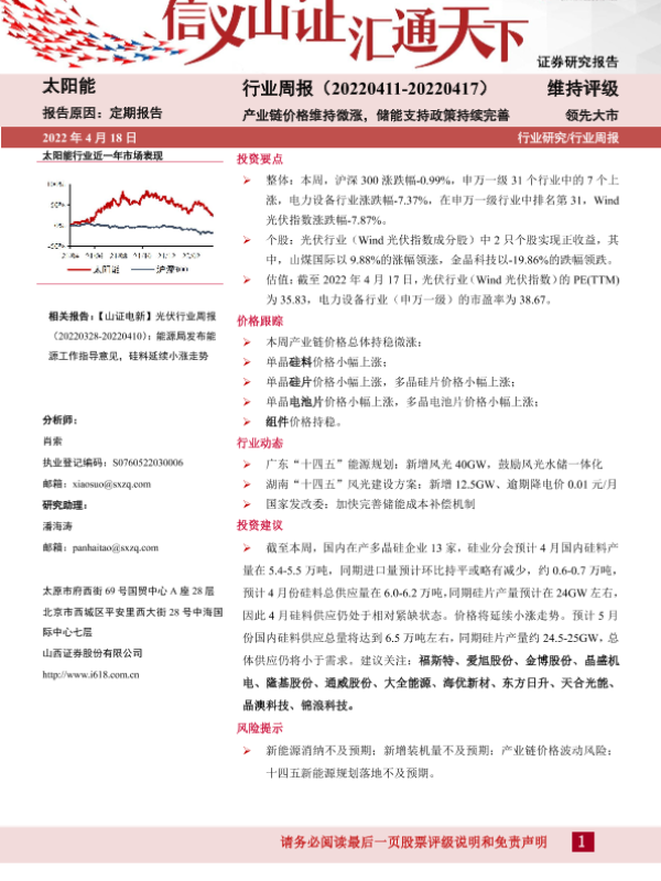 【山西证券】【20220418】20220418-山西证券-太阳能行业周报:产业链价格维持微涨,储能支持政策持续太阳能完善-11页