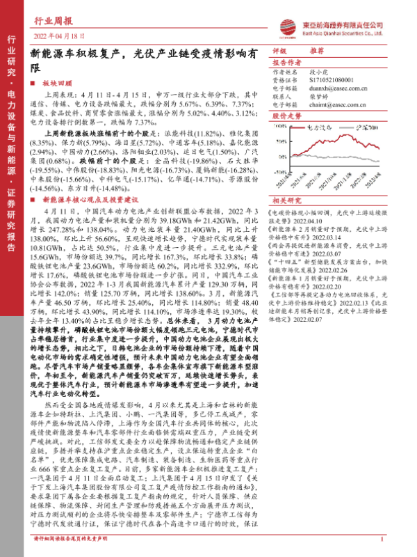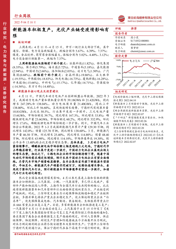 【东亚前海证券】【20220418】电力设备与新能源行业周报:新能源车积极复产,光伏产业链受疫情影响有限-30页