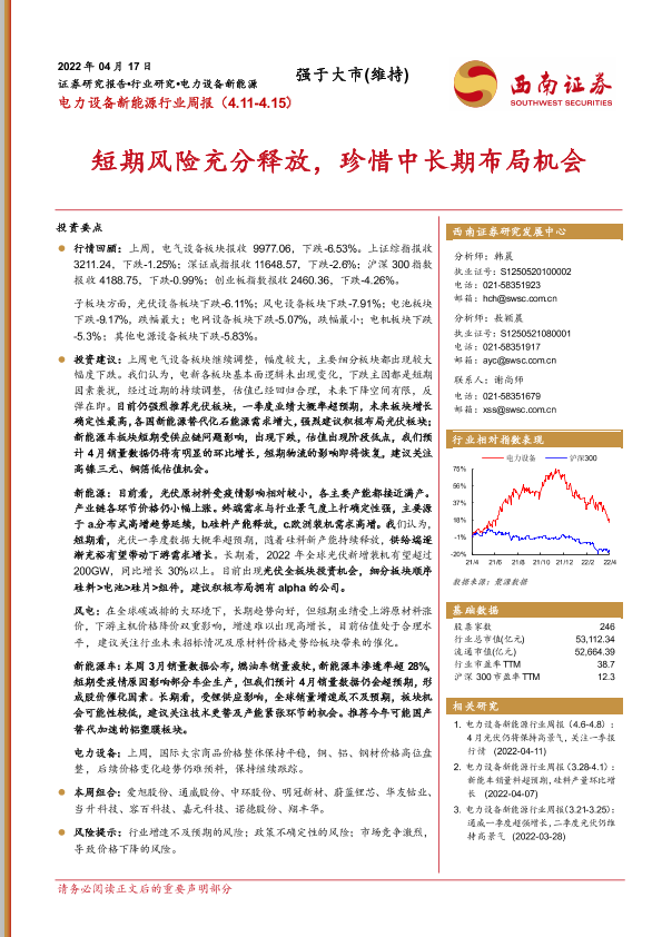 【西南证券】【20220417】电力设备新能源行业周报:短期风险充分释放,珍惜中长期布局机会-30页