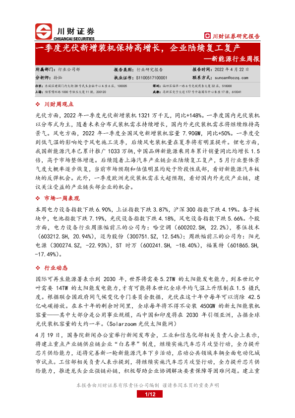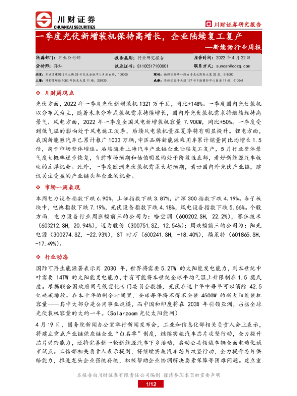 【川财证券】【20220422】20220422-川财证券-新能源行业周报:一季度光伏新增装机保持高增长,企业陆续复工复产-12页