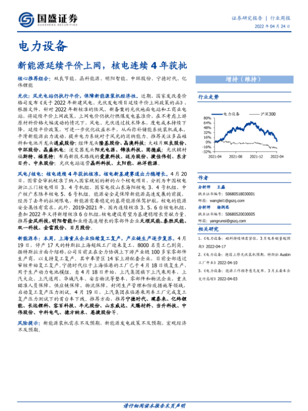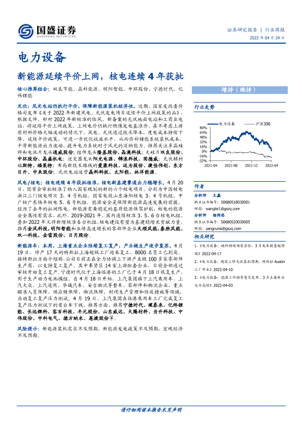 【国盛证券】【20220424】电力设备行业周报:新能源延续平价上网,核电连续4年获批-14页