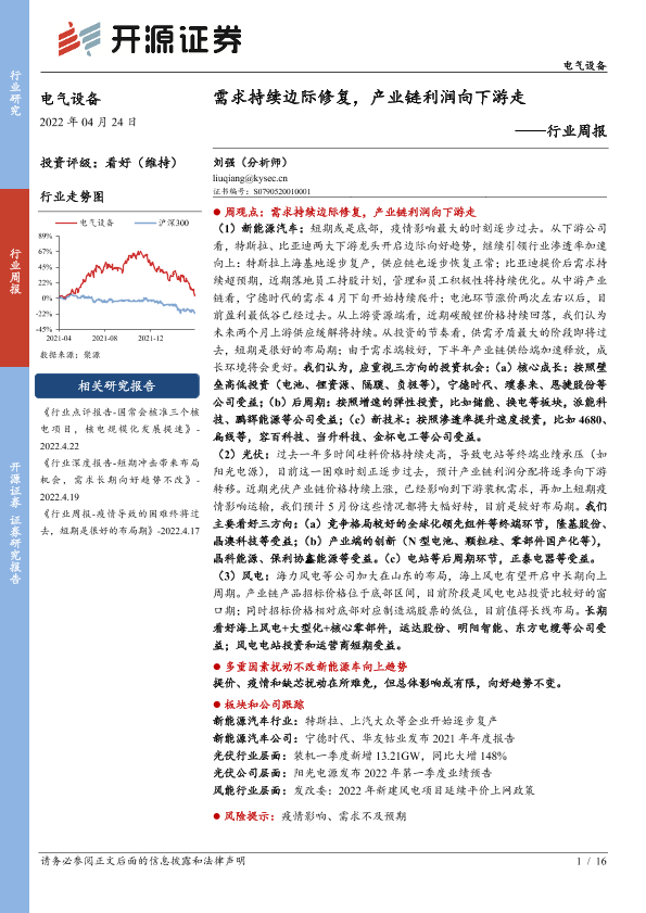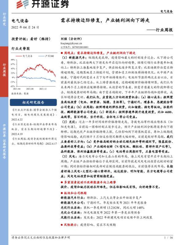 【开源证券】【20220424】20220424-开源证券-电气设备行业周报:需求持续边际修复,产业链利润向下游走-16页