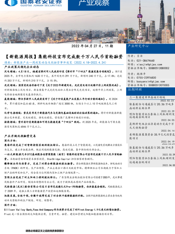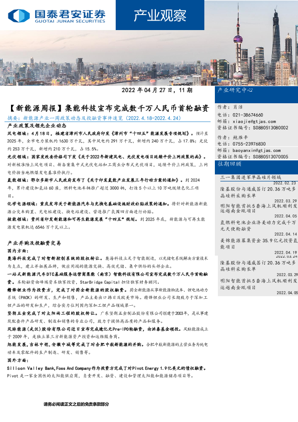 【国泰君安证券】【20220427】【新能源周报】集能科技宣布完成数千万人民币首轮融资-9页