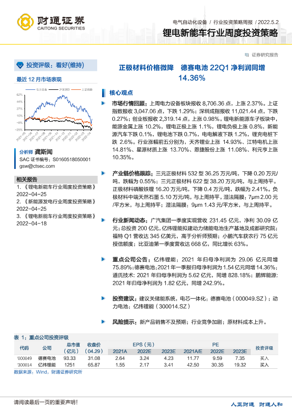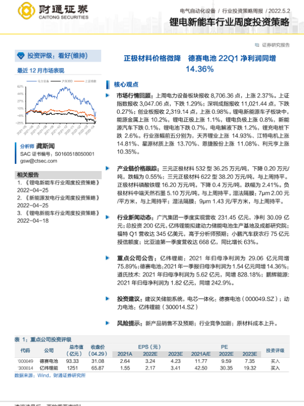 【财通证券】【20220502】20220502-财通证券-锂电新能车行业周度投资策略:正极材料价格微降 德赛电池22Q1净利润同增14.36%-17页