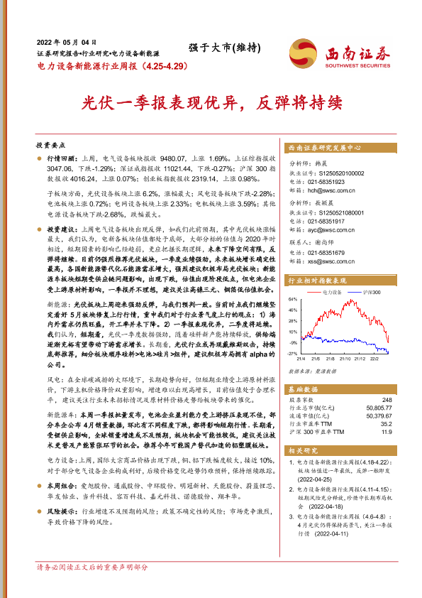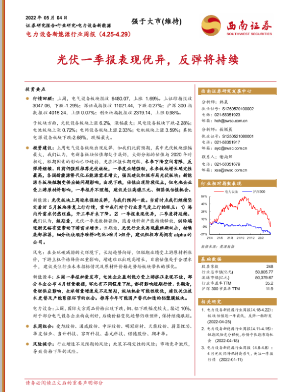 【西南证券】【20220504】电力设备新能源行业周报:光伏一季报表现优异,反弹将持续-30页