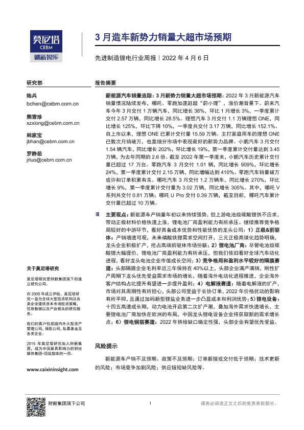 【莫尼塔研究】【20220506】先进制造锂电行业周报:3月造车新势力销量大超市场预期-12页