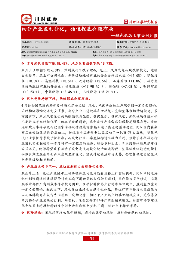 【川财证券】【20220508】绿色能源上市公司月报:细分产业盈利分化,估值探底合理布局-14页