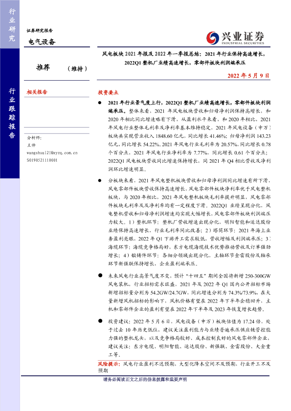 【兴业证券】【20220509】风电板块2021年报及2022年一季报总结:2021年行业保持高速增长,2022Q1整机厂业绩高速增长,零部件板块利润端承压-14页