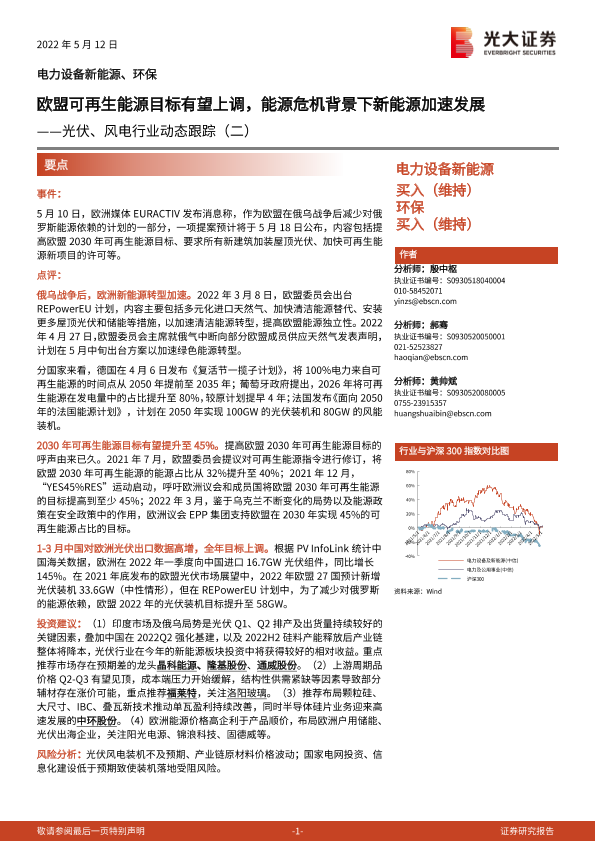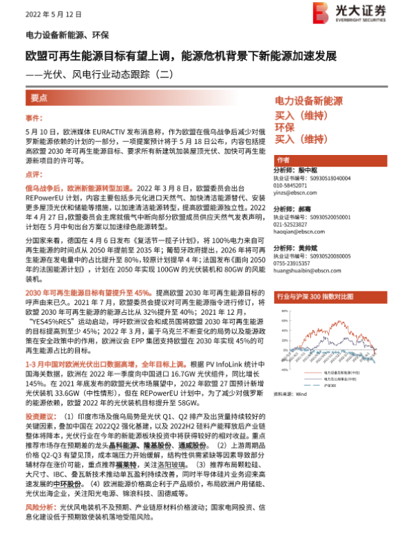 【光大证券】【20220512】光伏、风电行业动态跟踪(二):欧盟可再生能源目标有望上调,能源危机背景下新能源加速发展-2页