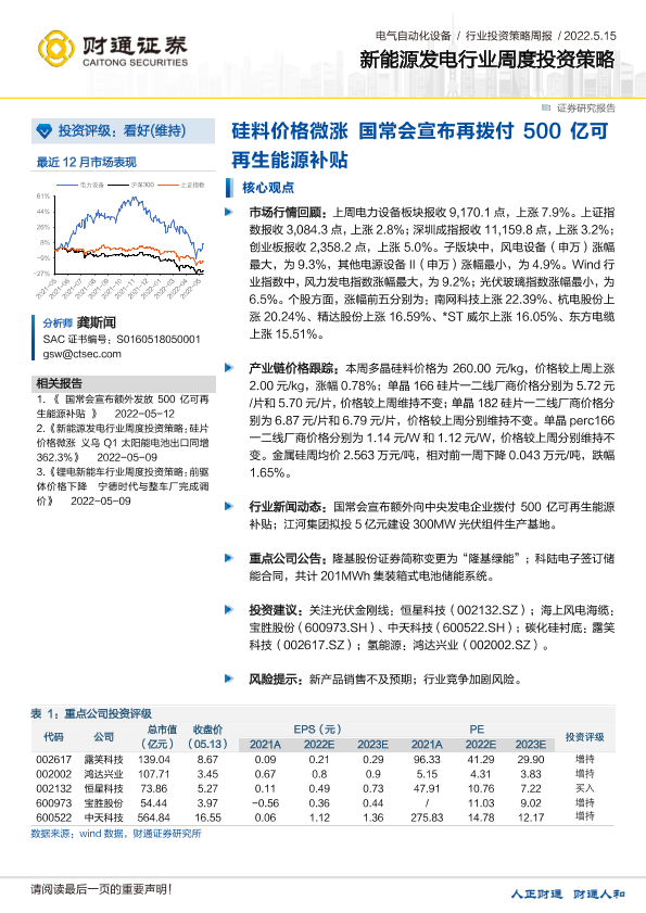 【财通证券】【20220515】20220515-财通证券-新能源发电行业周度投资策略:硅料价格微涨 国常会宣布再拨付500亿可再生能源补贴-20页