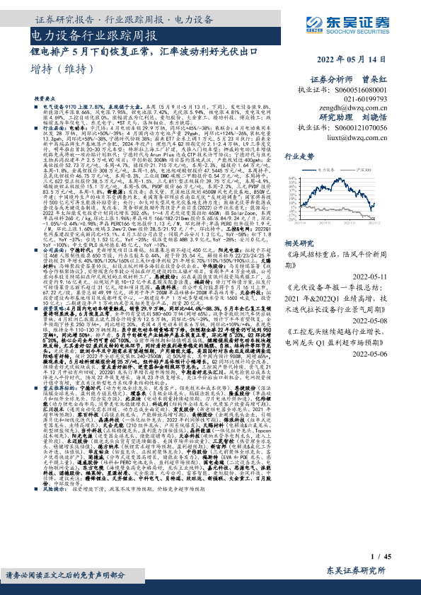 【东吴证券】【20220514】电力设备行业跟踪周报:锂电排产5月下旬恢复正常,汇率波动利好光伏出口-45页