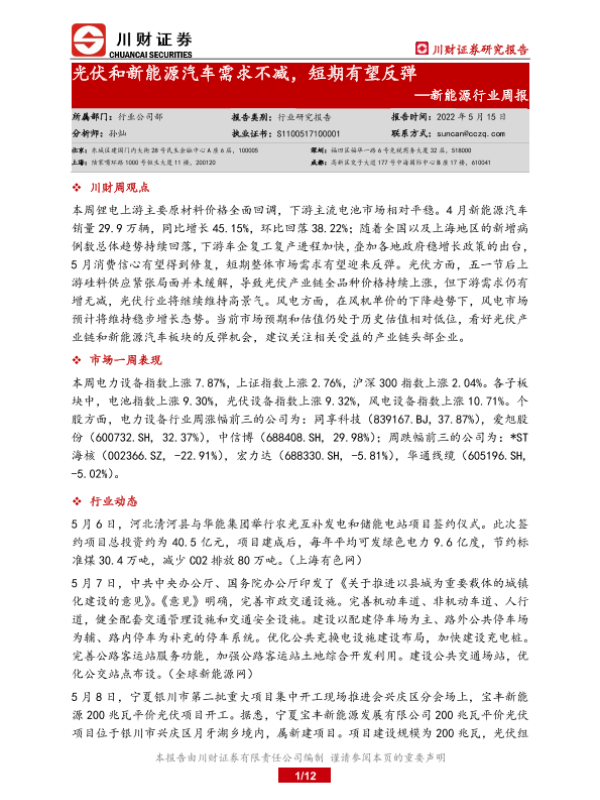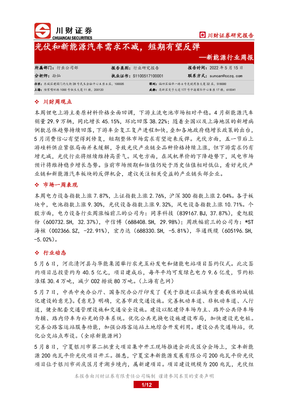 【川财证券】【20220515】20220515-川财证券-新能源行业周报:光伏和新能源汽车需求不减,短期有望反弹-12页
