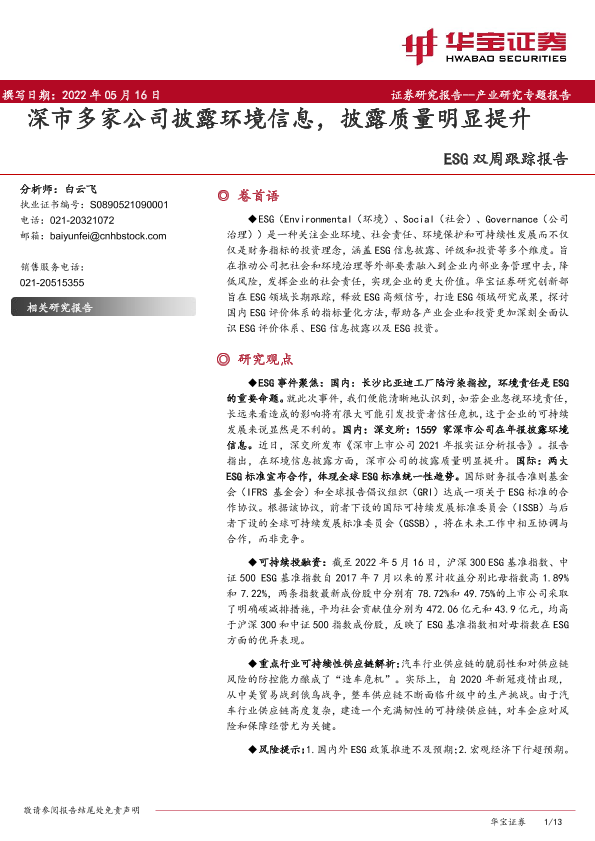 【华宝证券】【20220516】20220516-华宝证券-ESG双周跟踪报告:深市多家公司披露环境信息,披露质量明显提升-13页