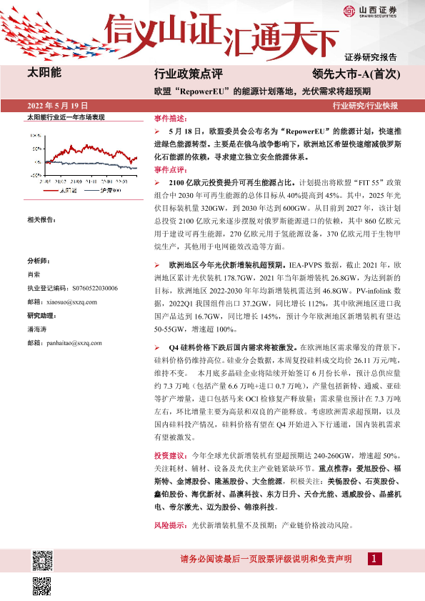 【山西证券】【20220519】太阳能行业政策点评:欧盟“RepowerEU”的能源计划落地,光伏需求将超预期-3页