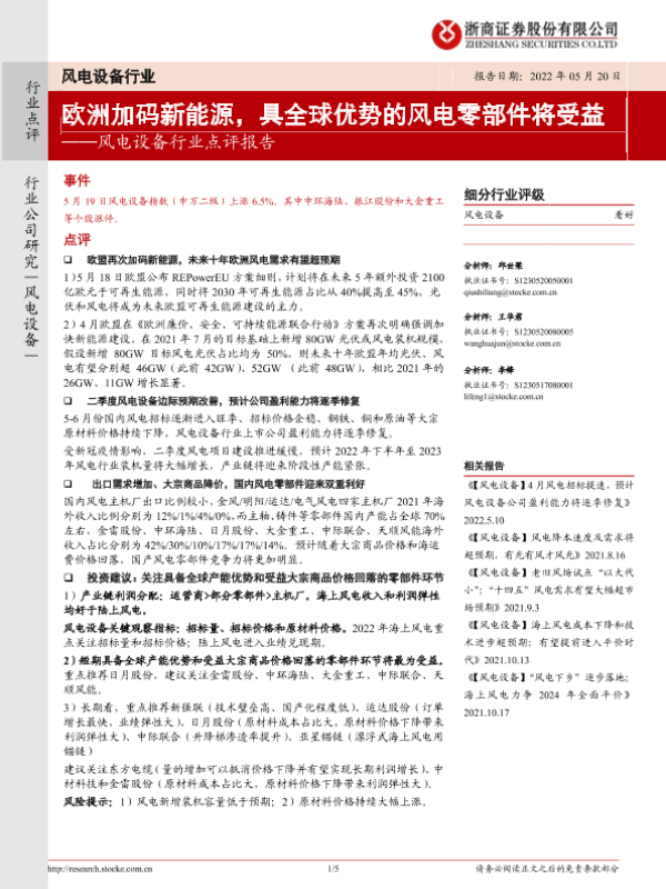 【浙商证券】【20220520】20220520-浙商证券-风电设备行业点评报告:欧洲加码新能源,具全球优势的风电零部件将受益-5页