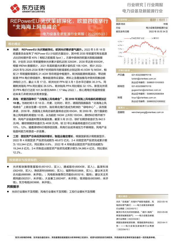 【东方证券】【20220524】电力设备及新能源行业周报:REPowerEU光伏策略深化,欧盟四国举行“北海海上风电峰会”-18页