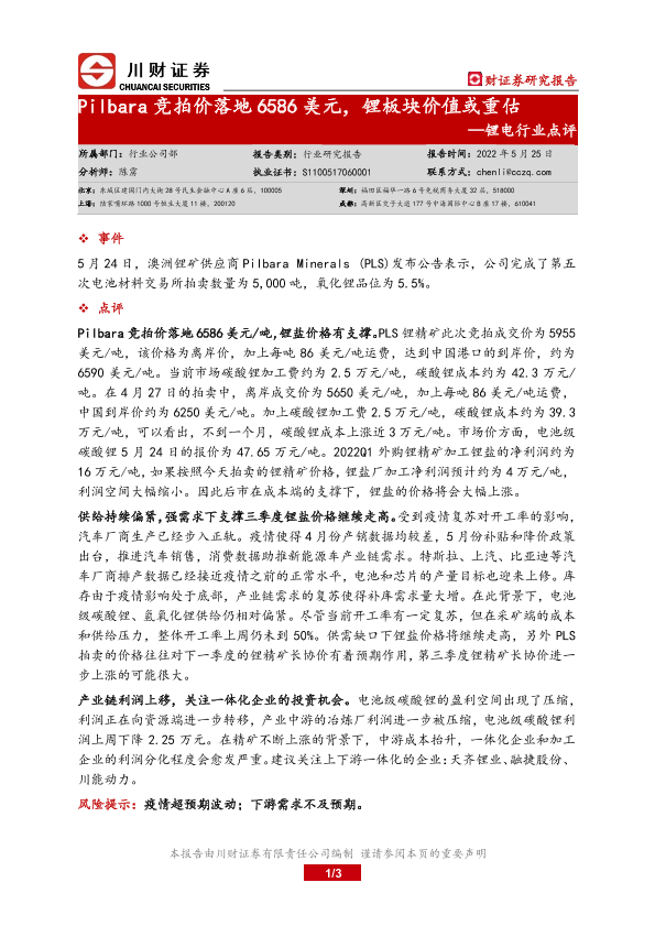 【川财证券】【20220525】20220525-川财证券-锂电行业点评:Pilbara竞拍价落地6586美元,锂板块价值或重估-3页