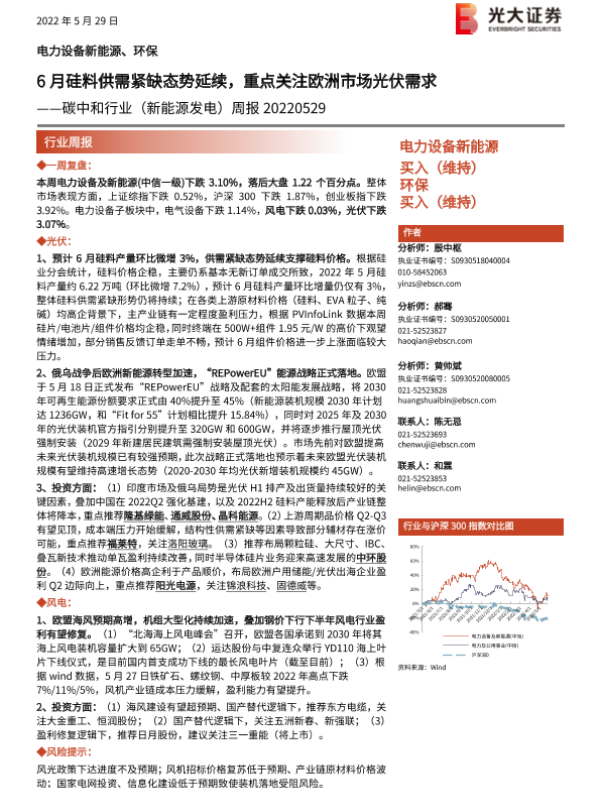 【光大证券】【20220529】20220529-光大证券-碳中和行业(新能源发电)周报:6月硅料供需紧缺态势延续,重点关注欧洲市场光伏需求-8页