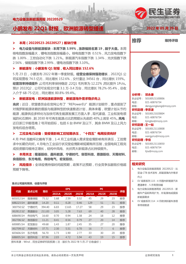【民生证券】【20220529】电力设备及新能源周报:小鹏发布22Q1财报,欧洲能源转型提速-30页
