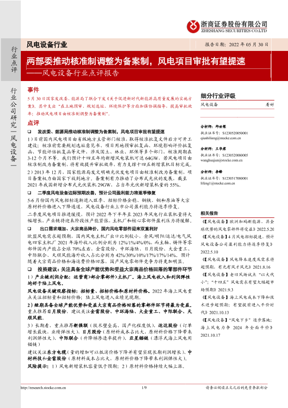 【浙商证券】【20220530】两部委推动核准制调整为备案制,风电项目审批有望提速-9页