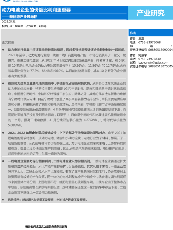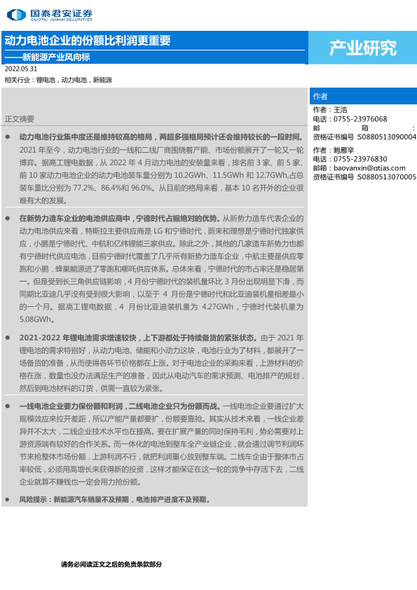 【国泰君安证券】【20220531】新能源产业风向标:动力电池企业的份额比利润更重要-2页