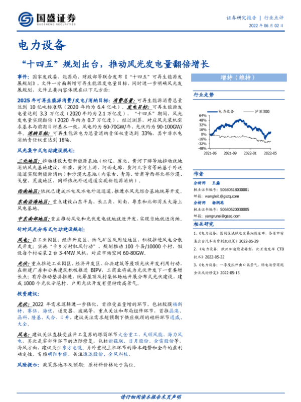 【国盛证券】【20220602】电力设备:“十四五”规划出台,推动风光发电量翻倍增长-3页