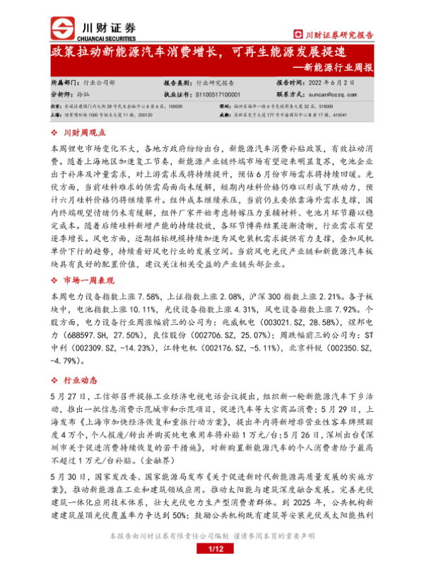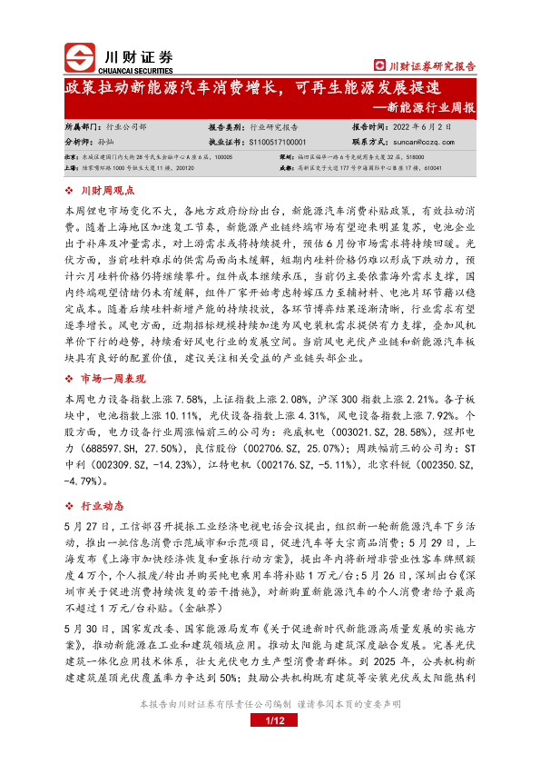 【川财证券】【20220602】新能源行业周报:政策拉动新能源汽车消费增长,可再生能源发展提速-12页