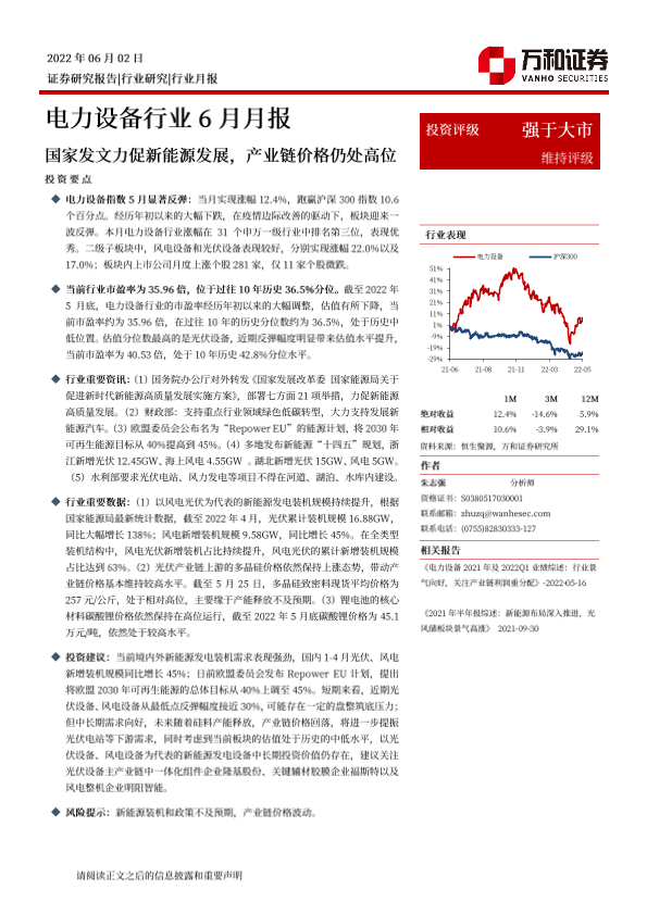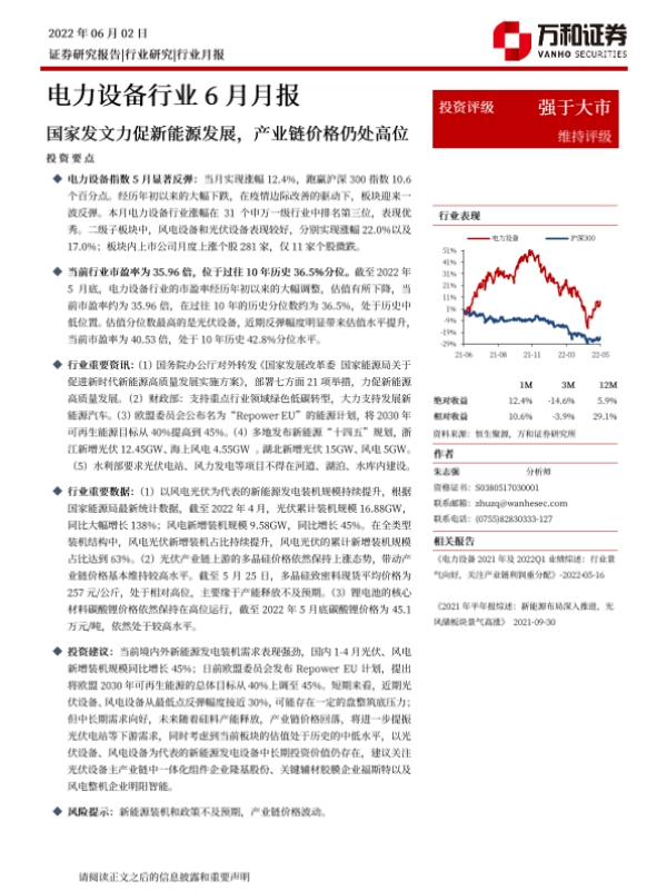 【万和证券】【20220602】电力设备行业6月月报:国家发文力促新能源发展,产业链价格仍处高位-12页