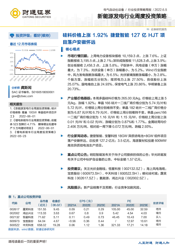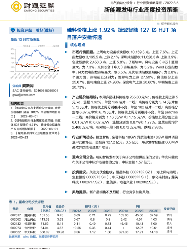 【财通证券】【20220605】20220605-财通证券-新能源发电行业周度投资策略:硅料价格上涨1.92%捷登智能127亿HJT项目落户安徽怀远-16页