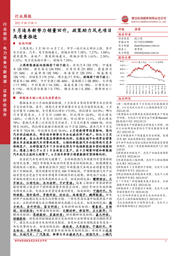 【东亚前海证券】【20220606】电力设备与新能源行业周报:5月造车新势力销量回升,政策助力风光项目高质量推进-28页