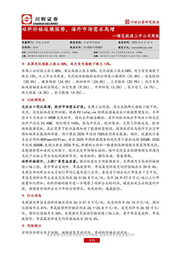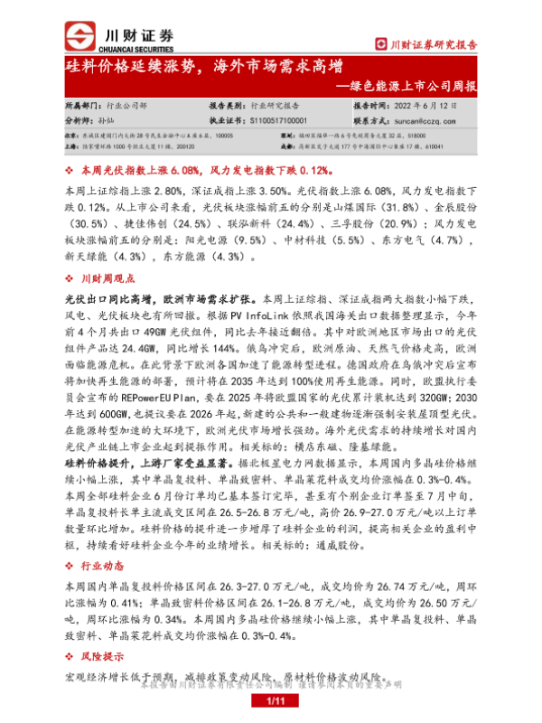 【川财证券】【20220612】绿色能源上市公司周报:硅料价格延续涨势,海外市场需求高增-11页
