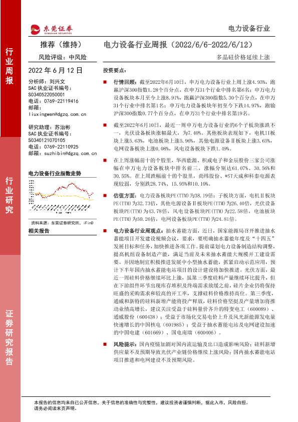 【东莞证券】【20220612】电力设备行业周报:多晶硅价格延续上涨-13页