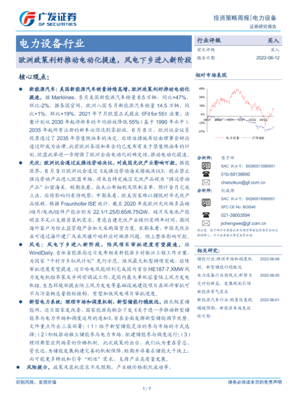 【广发证券】【20220612】20220612-广发证券-电力设备行业投资策略周报:欧洲政策利好推动电动化提速,风电下乡进入新阶段-7页