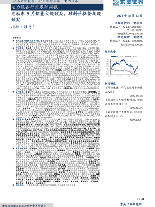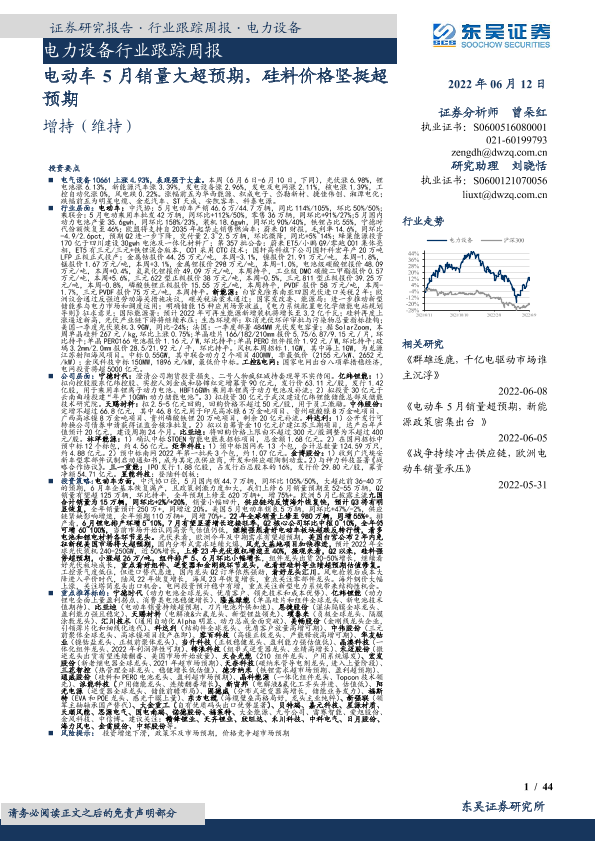 【东吴证券】【20220612】电力设备行业跟踪周报:电动车5月销量大超预期,硅料价格坚挺超预期-44页
