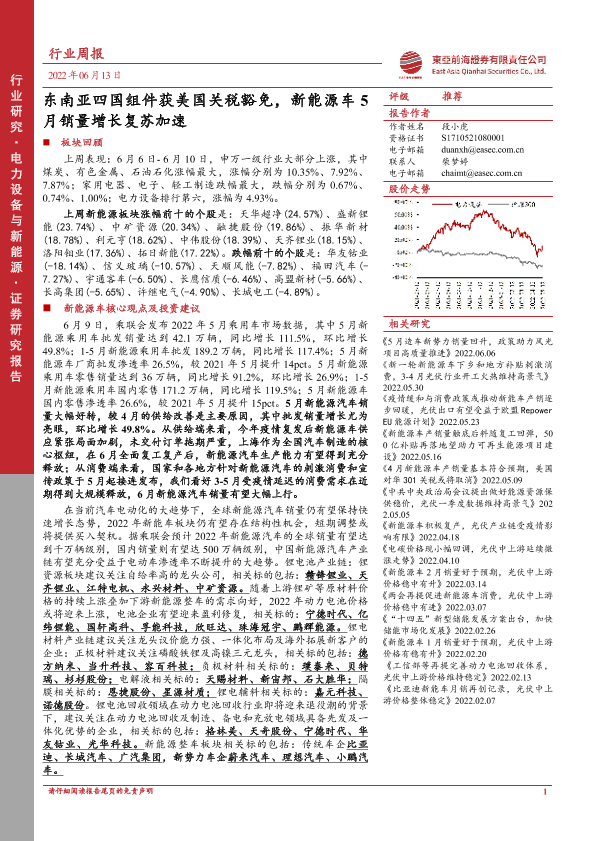 【东亚前海证券】【20220613】20220613-东亚前海证券-电力设备与新能源行业周报:东南亚四国组件获美国关税豁免,新能源车5月销量增长复苏加速-27页